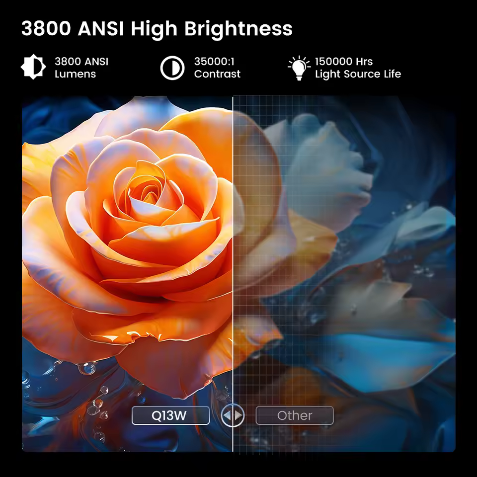 투잉어 Q13W는 무려 3800ANSI의 압도적인 밝기를 자랑합니다. 거실처럼 환경광이 어느 정도 있는 공간에서도 선명한 시청이 가능한 고성능 모델이죠.